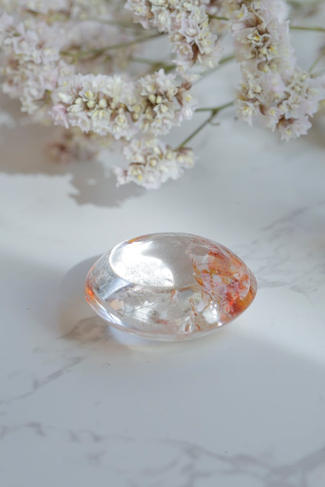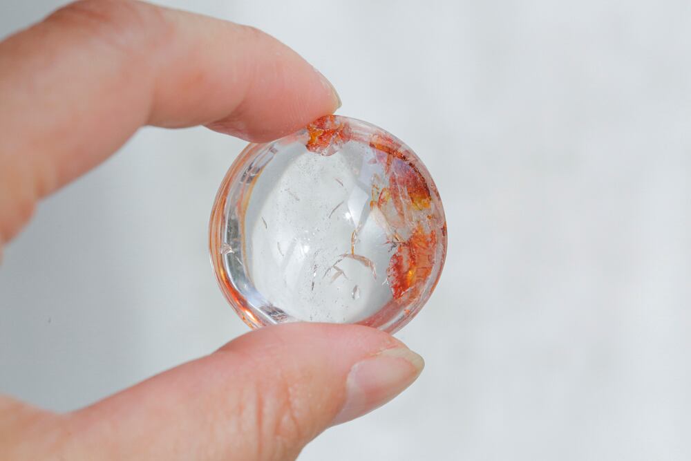 クリアクォーツの中にヘマタイト(赤鉄鉱)が入り、